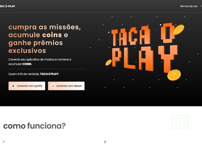 A gente construiu o produto inteiro: autenticação OAuth com Spotify e Deezer, sistema de missões com quizzes por gênero (Pop, Sertanejo, Rock, MPB, K-POP), lojinha de resgate com cupons únicos, perfil com dados puxados direto da conta de streaming, e um fluxo de onboarding que coleta nome, e-mail, telefone, endereço e preferências musicais em troca de moedas. Cada campo preenchido vale COINS. Cada quiz completado vale mais. Limite de uma missão por dia pra manter o retorno.