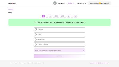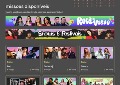 Plataforma de engajamento gamificado pra Universal Music Brasil. O objetivo: transformar fãs de música em leads qualificados. O usuário conecta o Spotify ou Deezer, completa quizzes por gênero musical, acumula moedas e troca por produtos e experiências exclusivas com artistas.